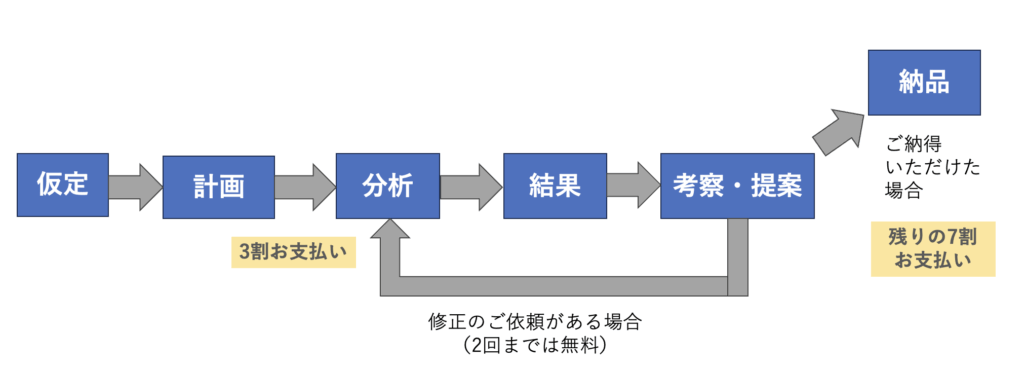 A. データ分析の計画をご提案した後に、契約金額の3割を所定の銀行口座(楽天銀行)にお支払いいただきます。