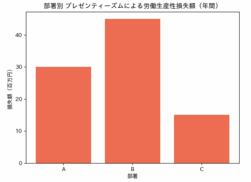 「プレゼンティーズム(出勤はしているものの、体調不良やストレスで本来の力を十分に発揮できない状態)」による労働生産性の損失金額を算出できます。