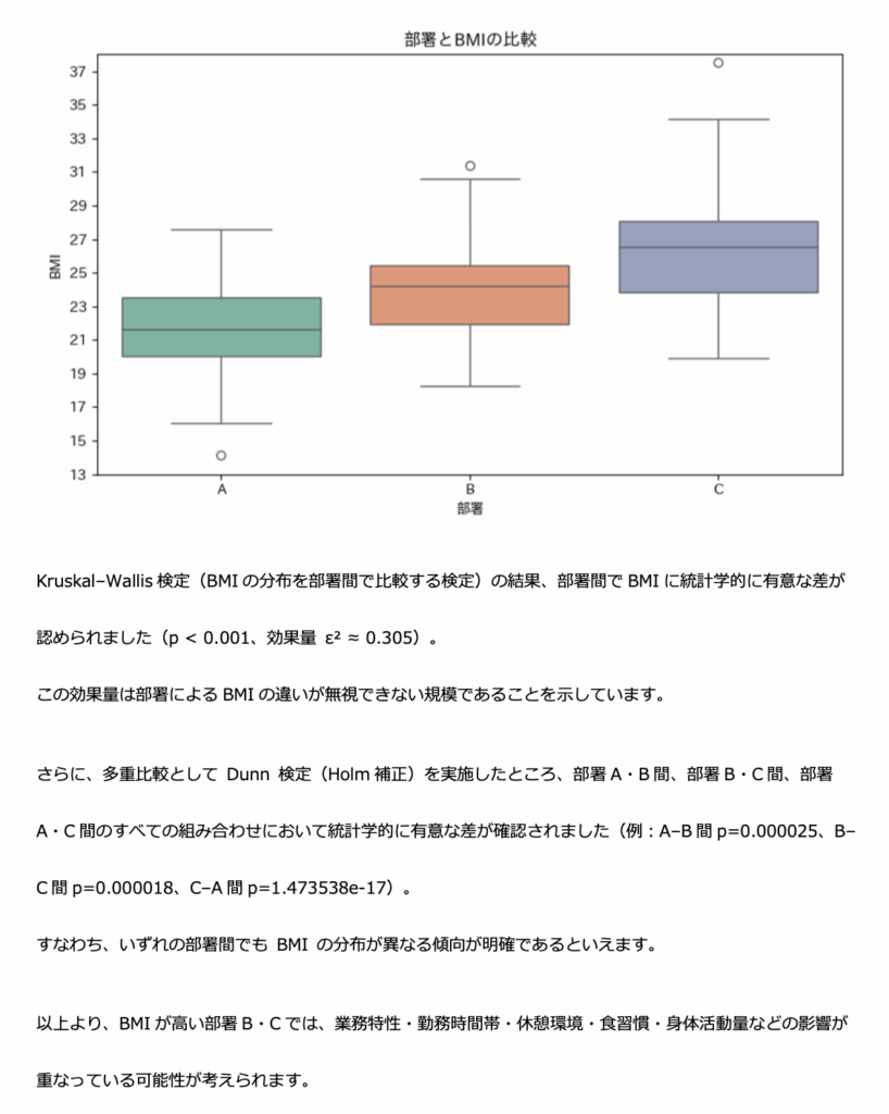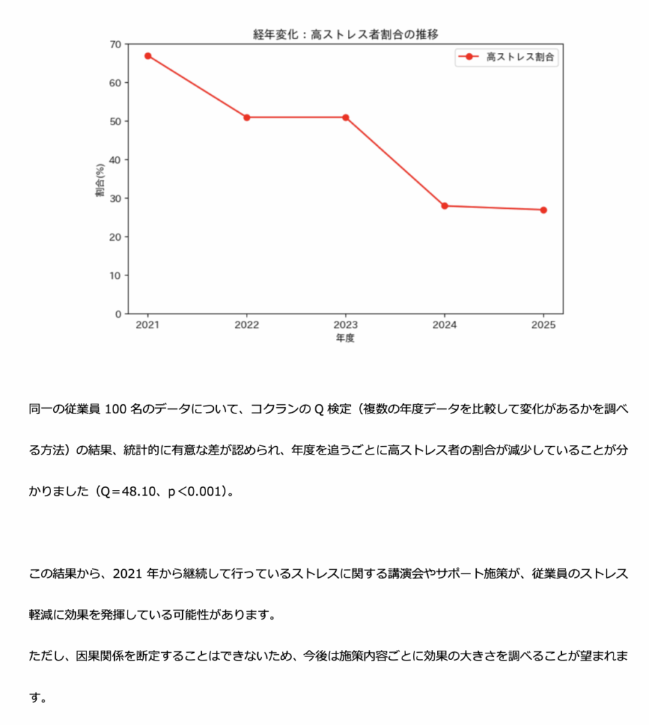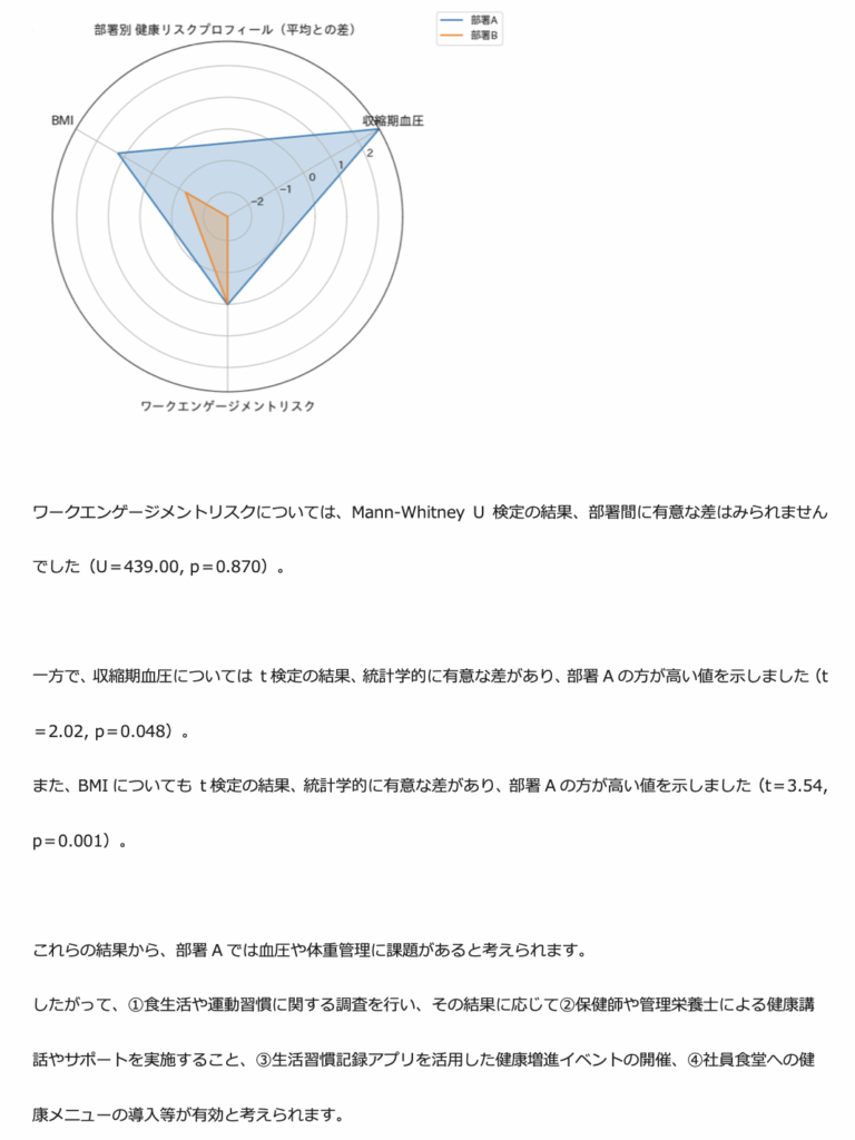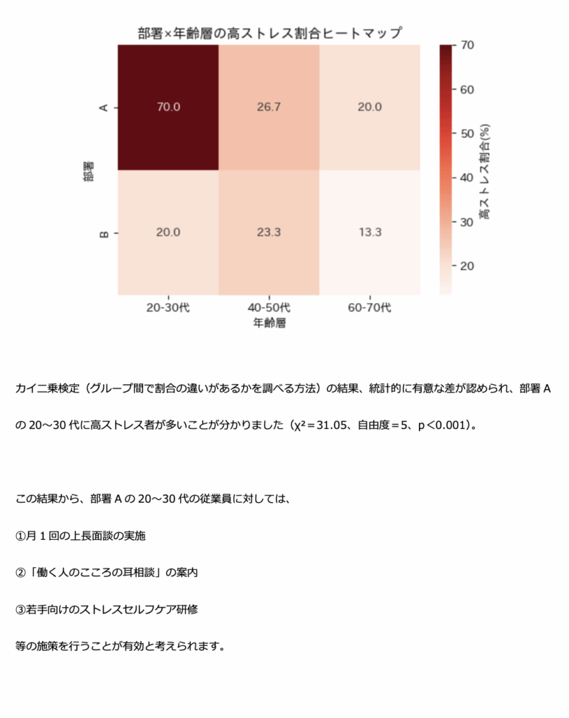 スタンダードプランの分析に加えて、複雑なクロス集計(部署×年齢層など)、散布図・ヒートマップ等といった高度な可視化を行い、文章ベースの改善提案も添えます。経営層や人事部門での健康経営の方針検討に役立つ内容です。
